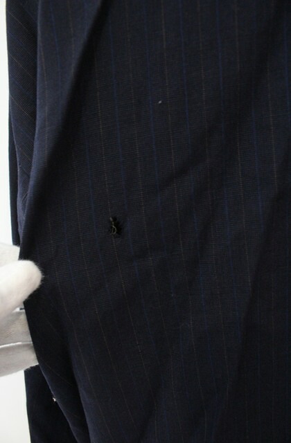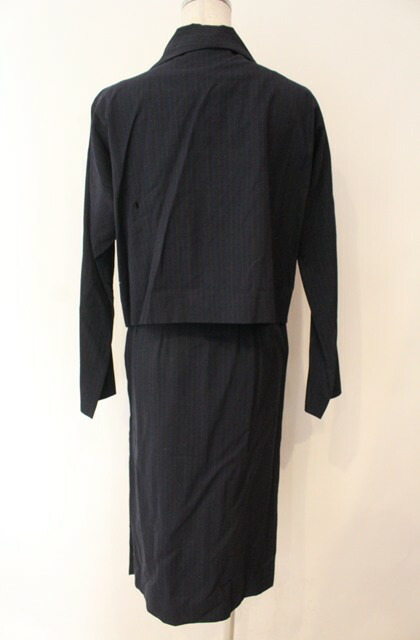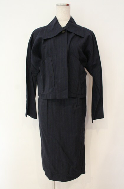 ![]() 【コンディション】 1/5 ジャケット各所に虫食い穴多数あり、背面に大きく穴、スカート虫食い穴、薄汚れ、生地スレ、品質タグ黄ばみ/1988年近辺に使われた「BORN IN ENGLAD」タグ。カット、丈感、大襟、ストライプ。現代でも十二分に通用するデザインの高さ。 【カラー】 ネイビー 【サイズ】(サイズ表記について) S
